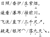 解析 背诵古诗要在熟读的基础上进行。读熟后自然成诵。例如,背诵《敕勒歌》,首先要弄清它的句式是“三三四四三三七”,各组句式对仗工整,非常利于背诵和记忆。其关键字眼顺序是“川——山——天——野——天——野——风”,意思很连贯,反复诵读几遍,即可背诵下来。《望庐山瀑布》可用联想法背诵:烟——挂——流——落。