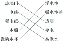 解析:本题考查的是生活中各种材料的用途与特性的联系。制作玻璃门的主要材料是玻璃和金属,玻璃门需要防风透光,利用了玻璃有坚硬、透明的特性;电线的材料是铜,它的作用是传输电能,就是利用了金属的导电性;餐巾纸的用途是及时吸去液体,就是利用了纸的吸水性;木船的主要材料是木头,它需要在水面上行驶,就是利用了木头的浮水性;瓷质水杯供人们饮水时使用,就是利用了瓷器坚硬、吸水性差的特性。