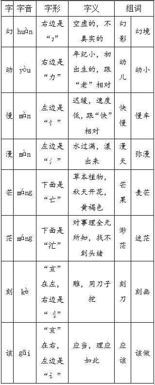 解析 同学们先把每组的字读一读,知道“慢—漫”“芒—茫”是同音形近字,“幻—幼”“刻—该”是形近字;接着按照书中的提示,先比较字形;然后通过查字典比较字义(既不相同,也不相近);最后组词。