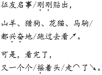 解析 本课的内容生动有趣,不同的人物有不同的情感,同一人物的情感也随着故事的发展有所变化。同学们在朗读时,要进入角色,体会并读出人物的不同情感。如,读第三自然段中的“山羊、猎狗、花猫、马驹都兴奋地跑过去看。可是,看完了,又一个个摇着头走了”时,我们要把自己当做山羊、猎狗、花猫、马驹,想象大伙儿当时是怀着怎样的心情去的,又是怀着怎样的心情离开的,把大伙儿由兴奋到失望的感情读出来。再如,小牛的感情变化:一个朋友也没有找到时的失望——见到老牛时的抱怨和伤心——找到朋友后的喜悦,这样的感情变化我们可通过图文结合,进行观察、体会,朗读时要用不同的语气读出这种变化。