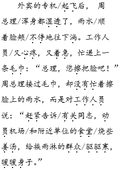 外宾的飞机起飞后,周总理赶紧指示工作人员告诉有关同志烧些姜汤,为淋雨群众驱寒,暖身子。此时,总理想到的是人民群众的冷暖,表现了周总理对人民无限的热爱。