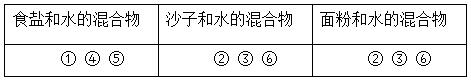 解析:本题考查面粉、沙子和食盐是否能溶解在水中,食盐能溶解在水中,面粉和沙子不能溶解在水中。