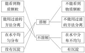 解析:本题考查的是溶解和不溶解的特点,有沉淀、能看到物质颗粒、能用过滤的方法将物质分离出来、物质在水中分布不均匀,都说明该物质不溶解。而溶解则是用肉眼看不到颗粒、物质在水中分布均匀、没有沉淀、不能用过滤的方法将物质分离出来。