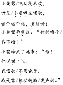解析 课文的第二、三自然段以对话的形式,写了小黄莺寻找歌手的过程,很适合分角色朗读。在分角色朗读时,同学们首先要分清有哪些角色,然后要读出小黄莺对大家的称赞,用真诚、热情的语气;读小蜜蜂、小青蛙的话时,要读出它们耐心地告诉小黄莺的情态。