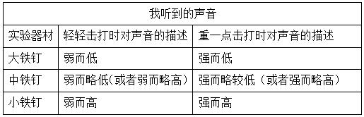 解析:本题考查能否够通过击打铁钉的活动,细致地听声音并对声音用高、低、强、弱及略高或者略低来进行描述。