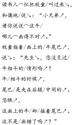 解析 朗读这篇课文时,前两个自然段是叙述的语言,宜用平淡的语气;后五个自然段,对话较多,宜用不同的语气朗读。特别是读青年和老人对画作表示赞叹时,宜用高昂赞美的语调;读牧童挑出画作中的错误时,要用孩子顽皮而又兴奋的语调;读读书人虚心请教及接受牧童的意见时,要用温和谦虚的语调。