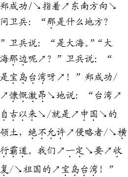 解析 本文歌颂了郑成功的爱国热情和民族气节。朗读的基调是慷慨激昂的。朗读第一自然段时,语气平静,语速适中,语调平稳。朗读第二至六自然段收复台湾的经过时,语调激昂,语气铿锵,语速较快。其中第三自然段郑成功与卫兵的对话,要突出人物的语气,读出悲愤、深沉的情感。第六自然段,换成轻松、愉悦的语调,读出成功收复台湾后军民的兴奋与喜悦。朗读第七、八自然段时,语气亲切舒缓,语调清新上扬。第九自然段概括全文,语速较缓,语气坚实有力,语调上扬,慷慨激昂。