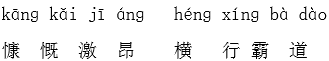 答案 慷慨激昂:教练员慷慨激昂的话语极大地鼓舞了队员们的士气,他们的心里充满了对胜利的渴望。 横行霸道:解放军马上就要攻城的消息让那些平时横行霸道的土豪劣绅惊恐万状。