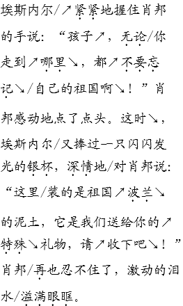 解析 本文表现的是肖邦强烈的爱国主义情感。朗读本文的感情基调是激昂、悲愤和痛惜的。语调高昂悲愤,语速缓慢。开头第一自然段,朗读时要用悲愤的语气,重读“瓜分”“陷入”“不得不”等词语;朗读第二自然段与亲友告别时,要重点抓住“咏唱送别曲”“老师的叮嘱”“赠送银杯”等场景,语气深情真挚,语调深沉低缓,用语言再现感人场面;朗读第三、四自然段时,要体现出激昂悲愤的语气和语调;第五自然段肖邦弥留之际,用缓慢的语速、低沉的语调来读;朗读第六自然段,语速缓慢,语气痛惜。