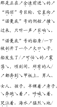 解析 本文歌颂了哈尔威船长忠于职守、舍己救人的崇高精神。朗读的基调是慷慨、悲壮的,语气是紧张、急促的,语调激昂,语速较快。朗读第一、二自然段时,“诺曼底”号正常航行的部分,用平缓、轻快的语调,发现“玛丽”号并被它撞击的部分,用急促的语调,情况万分危急的部分,用紧张的语调。第三至二十八自然段,黑暗中“一段简短有力的对话”,语速应急促;哈尔威的命令是威严的,语调凝重有力。第二十九、三十自然段,语速平缓,语调庄重,通过朗读突出哈尔威船长视死如归的高大形象。