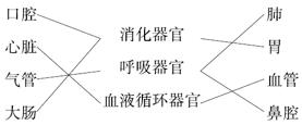 解析:人体的消化器官主要有:口腔、食道、胃、小肠、大肠;呼吸器官有:鼻腔、咽喉、气管、肺;血液循环器官有:心脏和血管。