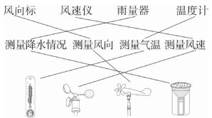解析:(左起)图一是温度计,它的作用是测量气温。图二是风速风向仪,它的作用是可以测量风速和风向。图三是风向标,它的作用是测量风向。图四是雨量器,它的作用是测量降水情况。