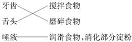 解析:牙齿的作用是磨碎食物。舌头的作用是搅拌食物。唾液能润滑食物,同时含有淀粉酶,能消化部分淀粉。