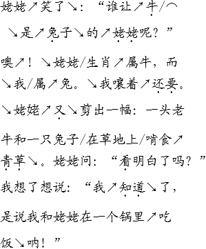 解析 这篇课文着重写了姥姥剪纸的手艺高超以及“我”与姥姥在一起的浓浓亲情,语言清新活泼,优美流畅,情感饱满。朗读时,姥姥的语气是和蔼可亲的;“我”的语气是稚嫩调皮、生动活泼的。第一至三自然段要读出赞叹的语气,语调活泼生动,语速较快。朗读第十三自然段时,语气深沉亲切,饱含深情,语调舒缓,语速稍慢一些。