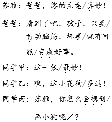 解析 这道题是让同学们联系生活实际,加深对爸爸的话的理解。苏雅把画儿弄脏了,在爸爸的建议下,她画了一只小花狗,最后她的画儿获得了第一名。这是一个坏事变好事的例子。在生活中,相信你也曾碰到过这样的事。仔细想一想,和同学说一说。