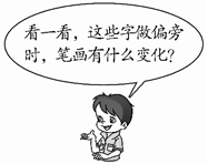 解析 这道题是让同学们知道,有些字做偏旁时,笔画会发生变化,同学们先把这些字读一读,然后认真观察一下,它们的偏旁都发生了哪些变化。“木、米、火”做左偏旁时,末笔捺要变成点;“女、王”做左偏旁时 ,末笔横要写成提;“竹”做偏旁时,竖、竖钩变成点;“足”做偏旁时,最后两笔变成短竖、提;“牛”做偏旁时,下横变成提,而且笔顺也发生了变化: