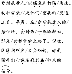 解析 这是一篇知识性较强的文章。同学们要在朗读中了解与体验。课文的第1自然段对极昼和极夜的描述,语言优美,感染力强,同学们可借助图画感受这种美好的氛围,反复朗读,把这个冰天雪地的世界充满的温馨和浪漫的气息读出来。朗读第2自然段,要注意突出爱斯基摩人居住地的寒冷气候。读第3自然段,同学们要把自己当成一个爱斯基摩人,正甩着响鞭、乘着满载猎物的雪橇奔驰在雪原上……要读出一个“趣”字。