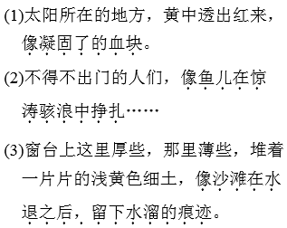 答案 (1)“像凝固了的血块”,运用了比喻的修辞方法,形象地表现了太阳在黄沙狂风的肆虐中的死气沉沉,阴森可怕,仿佛世界末日就要来临。(2) “像鱼儿在惊涛骇浪中挣扎”,把狂风中的人比喻成挣扎在惊涛骇浪中的鱼儿,可想而知,风沙是何等的凶猛和令人恐怖。也说明疯狂的风沙让不得不出门的人们尝尽了苦头。(3)“像沙滩在水退之后,留下水溜的痕迹”,将窗台上堆积的浅黄色细土比喻成沙滩水退之后留下的水溜的痕迹,与前文中的“惊涛骇浪”呼应,让人真切地感受到“浩劫”之后的平复。