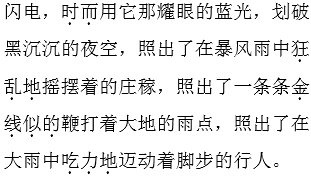 解析 背诵时,可根据段落的写作方法或构段特征选择合适的背诵方法。如第1自然段,可抓住雷雨前自然景物的典型特征(黑暗、雷声沉闷而又迟钝、闪电闪烁、空气闷热而潮湿)来逐句背诵。第3自然段,可抓住作者描写风来时的几个典型事物(夜行人的衣襟、枯叶、田里的高粱、树上的枯枝等)的形态、声音来背诵。