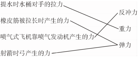 解析:本题考查各种物体运动时所产生的力。提水桶时,水桶由于重力的原因会对手产生拉力;橡皮筋被拉长、射箭弓线被拉长都会产生弹力;喷气式飞机依靠气体的反冲力来运动。