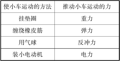 解析:使小车运动的方法有很多,其中这两种方法可操作性强,方便易行。挂垫圈是利用垫圈的重力使小车运动的;使用橡皮筋,是利用橡皮筋的弹力运动的。
