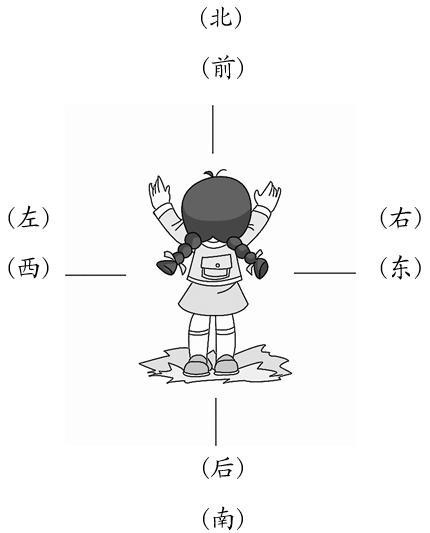 解析 本题考查了地图中“上北下南,左西右东”的方向知识,同时又考查了方位间的相对关系。我们首先来看图,图中的小女孩面向前,和“前”相对的是什么方位?她的左、右各在哪里?同时,小女孩背向南方,那么她面向哪个方向?她的左边应是哪个方向?右边呢?可以自己来做一做这个实验,看看自己的左、右各是哪个方向。