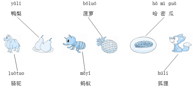 解析 这个练习是对读拼音、识词语、认事物的训练。在朗读时要读准声母、韵母和声调,要注意“哈密瓜(hā mì ɡuā)”第一个字读“hā”,是第一声,不是第三声;“骆驼(luò tuo)”和“狐狸(hú li)”第二个拼音读轻声。