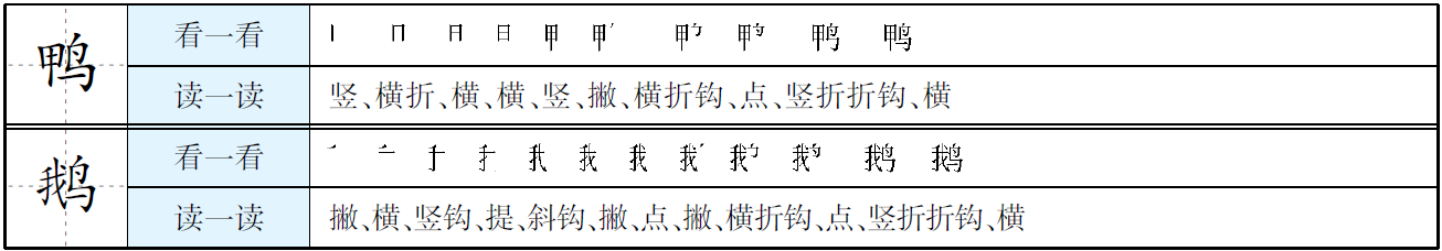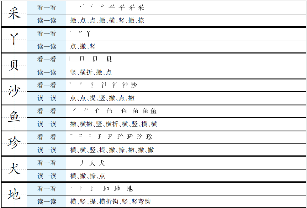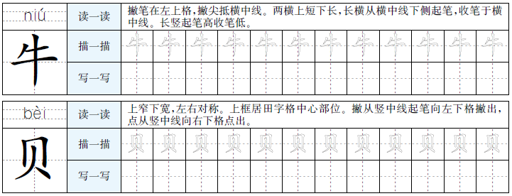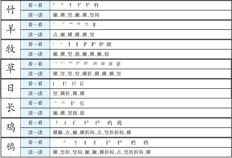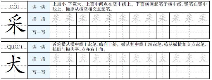 解析 这道题方格里所列的范字都是我们学过的生字,同学们可以先依次读汉字,按顺序说说每个字的笔顺,然后在相关的课文后面的田字格里描红,注意不要涂抹。
