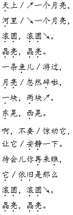 解析 《河里的月亮》这首小诗意境优美,内容虽简短,画面感却很强,读起来朗朗上口。朗读时,语气应是亲切的,语速应稍慢,并注意停顿和重音的把握。如:“天上一个月亮,河里一个月亮”一句应该用叙述的语气,把月夜安静、祥和的特点读出来。“滚圆,滚圆,晶亮,晶亮”要注意重音和停顿的把握,读出节奏感;“一块,两块,东晃,西晃”同样要注意重音和停顿的把握,但要加快语速,读出动感和神秘感。