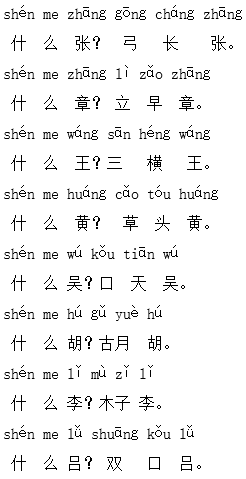 解析 我们先来看一看图画,像图中的小朋友一样试着一问一答。然后读一读,注意一些表示姓的汉字的结构形式,读准姓拆开的两个字的音,如“弓长、立早”等。