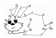 解析 完成此题必须掌握23个声母在字母表中的顺序。因此,连线前要按顺序背出23个声母,然后进行连线。连线时,从b开始,按顺序连。连好后,同学们就会发现由23个声母组成的小动物是可爱的小白兔。