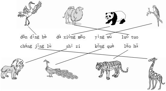 解析 同学们先看看图上画了哪些动物(丹顶鹤、骆驼、大熊猫、鹦鹉、狮子、孔雀、老虎、长颈鹿),再拼拼中间的音节,最后把音节和动物连起来。
