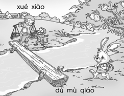 解析 同学们先拼读图上的音节,再仔细看图,弄清图意(独木桥很窄,只容一人通过;小兔子去学校、猴子摘桃子都要过独木桥),最后想想该怎样过桥。把想象的故事说完整。