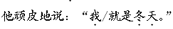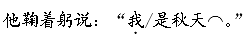 解析 首先要大声地读,加深自己的感受,如“草芽尖尖”可读得轻些,表现出草芽的柔嫩;谷穗“鞠着躬说”,可以读出谦虚的感觉;“雪人大肚子一挺”可以做出挺肚子的动作,以表现顽皮的样子。
