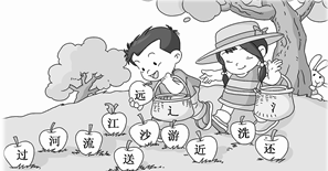 解析 你看出这两个小朋友在干什么吗?哦,原来他们在拾苹果呢!这道题就是要求把带“氵”和“辶”的字分别找出来。带有“氵”的字的苹果放进小女孩的篮子里,带有“辶”的字的苹果放进小男孩的篮子里。