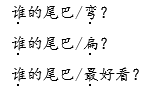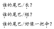 解析 本篇课文整体的朗读基调是轻松、欢快、俏皮的,就像两个小朋友在一问一答,做猜谜游戏。要着重读好问句:先读准句子中易读错的字,如“谁”;再读好一些词语中的轻声,如“谁的、尾巴”等;最后读好问句末尾词语的升调,如“长”“短”“一把伞”等。