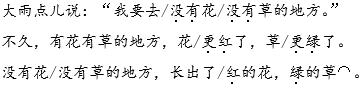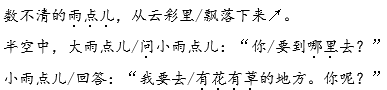解析 本文是以大雨点儿和小雨点儿的对话展开故事情节的,重点要读好疑问句的语气。朗读时,要注意“雨点儿”不能读成三个音节,“点儿”的读法是在“点”的后面加一个卷舌动作。最后一个自然段写得很美,读的时候,语速稍慢,注意“更”“红”“绿”要重读,一边读一边想象雨后田野的美丽景色。