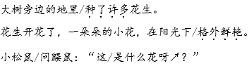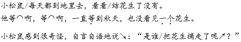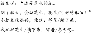 解析 本文语言浅显,富有童趣。朗读时,要抓住小松鼠情感的变化:小松鼠看到鲜艳的花生花时,要读出赞美的语气,语速稍快,表现小松鼠欣喜的心情;要用较慢的语速读他等待摘花生的句子,表现出急切的心情;最后,花落了,却没有摘到花生时,他心里犯嘀咕(dí ɡu),要低声读他说的话,表现他内心的不解。