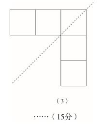 分析:方法一,在原图形的左下角加一个小正方形,这时的图形为轴对称图形,对称轴如图(1)所示。方法二,在原图形的右上角加一个小正方形,这时的图形为轴对称图形,对称轴如图(2)所示。方法三,在原图形的左上角加一个小正方形,这时的图形为轴对称图形,对称轴如图(3)所示。
