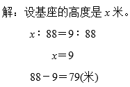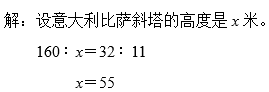 分析:先观察,得出红色纸条在直线上的1格代表5米,然后看绿色、蓝色、橙色纸条对应直线上的格数分别是多少,根据直线上的格数比等于实际米数的比列比例式,最后解比例。