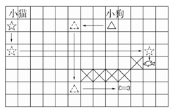 (答案不唯一)小猫先向下平移2格,再向右平移11格,最后向下平移1格就能吃到鱼;小狗先向左平移3格,再向下平移5格,最后向右平移4格就能吃到骨头。如图: