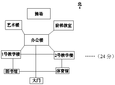 分析:先根据题中的方向标确定大门的北面是办公楼,再以办公楼为参照物,确定西南方向是1号教学楼,东南方向是2号教学楼,西北方向是艺术楼,东北方向是阶梯教室,北面是操场,最后确定1号教学楼的南面是图书馆,2号教学楼的南面是体育馆。