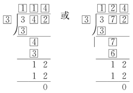 (4)分析:根据百位上相减后没有余数,可以确定除数是3,商的百位上是3÷3=1。根据个位上落下来的2可以确定被除数的个位是2。根据十位上相减的结果是1可知,被除数十位上的数字与除数和十位上的商的积的差就是1。当商的十位上是1时,被除数的十位上就应该是1×3+1=4;当商的十位上是2时,被除数的十位上就应该是2×3+1=7。最后确定答案有两种。