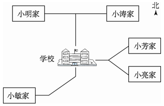 分析:根据图中右上角的指北方向标,以学校为观察点,确定五名同学家的位置。小明先向北面走,再向西面走回到了家,由此可知小明家在学校的西北方向,即在左上角;小涛先向北面走,再向东面走回到了家,由此可知小涛家在学校的东北方向,即右上角;小敏先向南面走,再向西南方向走,然后向西面走回到了家,由此可知小敏家在学校的西南方向,即左下角;小亮先向东面走,再向东南方向走回到了家,由此可知小亮家在学校的东南方向,即右下角;剩下的一个位置就是小芳家。