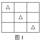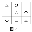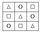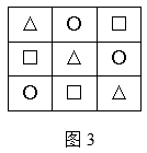 分析:先选择三角形来放,将第一个三角形放在第一行的第一个方格中,然后将第二个三角形放在第二行的第二个方格中,最后将第三个三角形放在第三行的第三个方格中,这样才能使竖行不出现重复的三角形,如图1;接下来放圆,将第一个圆放在第一行的第二个方格中,然后将第二个圆放在第二行的第三个方格中,第三个圆就只能放在第三行的第一个方格中,如图2;最后将三个正方形放在剩下的空格里就可以了,如图3。