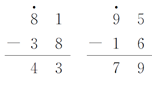 分析:通过观察得出,这是两道退位减法算式,根据运算顺序先算个位,第一道算式个位上应该是13-7=6,向十位借1当10,所以十位上的数就应该是3+2+1=6;第二道算式个位上( )-6=5,可以求出( )=11,即被减数是81,因为借给个位1个十,所以十位上的8应该先减1,再减2,所以差的十位上是5。
