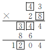 分析:先从个位入手,想3乘几的积的个位上的数是4,3乘8等于24符合条件,所以第二个乘数的个位上的数是8;再根据□3×2=86可以推出第一个乘数为43;两个乘数都已知,可填出其他□里的数。