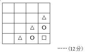 3.分析:先看横行,从上往下看,第二横行缺少 △ ,所以在第二横行的第四个空里填上△;然后从左往右看再看第二竖行,第二竖行中缺少△,所以在第二竖行的第四个空里填上△;这时通过观察发现图形从右上到左下斜行的排列规律,斜行的图形是相同的,那么第三横行的第三个空里就填上△,它的后面就填上○,再接着填第四横行的第三个空里填上○,它的后面就填上□。