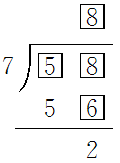 分析:观察第一个竖式,已知除数是7,除数与商的积是5□,想7和几相乘得5□,商就是几,因为7×8=56,所以商是8。又因为余数是2,由“被除数=商×除数+余数”可知,被除数是58,所以第一个竖式填写完成后是