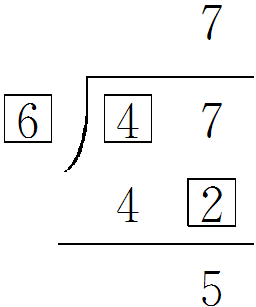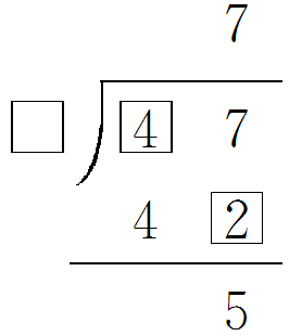 观察第二个竖式,因为被除数个位上的数字7减去2才会得到余数5,所以4□的□中应该填2。又因为十位相减后没有余数,所以被除数十位上的数字应该是4,竖式就变成